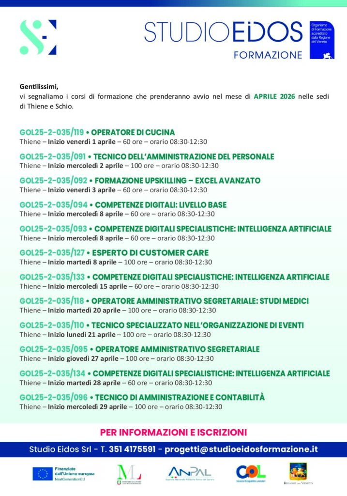 - Competenze digitali specialistiche: intelligenza artificiale STUDIO EIDOS SRL –Inizio 8 Aprile