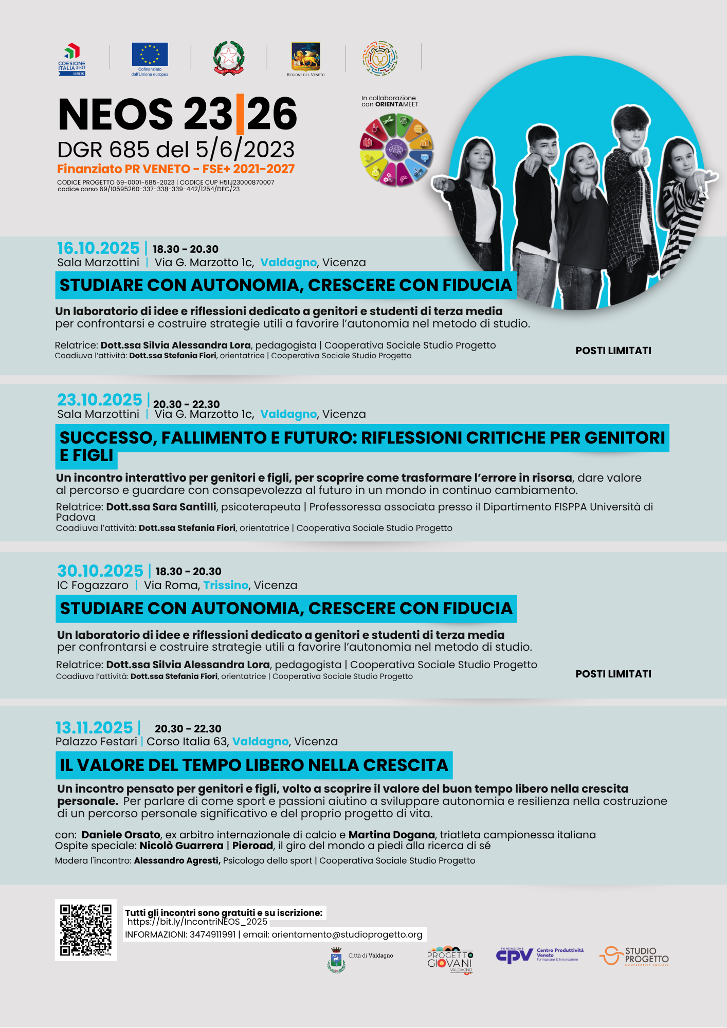 Il progetto NEOS 23|26, finanziato dalla Regione Veneto, e gestito da Cooperativa Sociale Studio Progetto e Fondazione Centro Produttività Veneto, in collaborazione con il Comune di Valdagno e gli Istituti secondari di primo grado della vallata dell’Agno, organizza 4 appuntamenti gratuiti, sono pensati per offrire a genitori, studentesse e studenti l’opportunità di costruire in maniera consapevole il futuro.