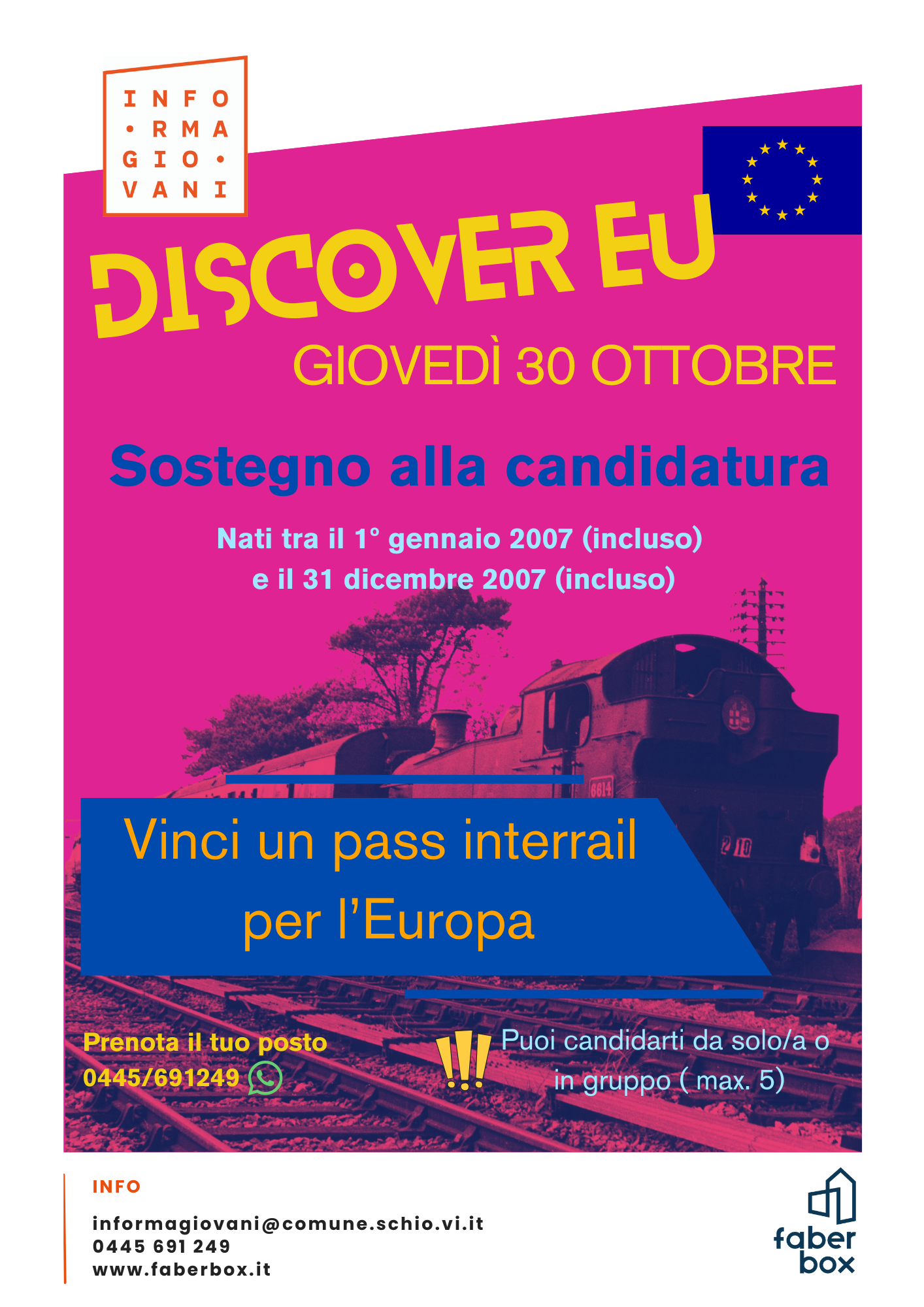 DiscoverEU è un’azione del programma Erasmus+ che dà l’opportunità di viaggiare ed esplorare la diversità dell’Europa, di conoscere il suo patrimonio culturale e la sua storia e di entrare in contatto con persone provenienti da tutto il continente. Riceverai un pass per spostarti con i mezzi di trasporto più rispettosi dell’ambiente, come i treni.
