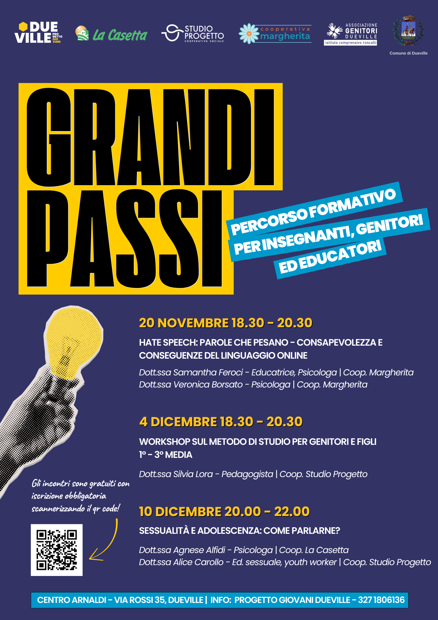 Siamo liete di informarvi che a novembre prenderà avvio l’iniziativa “Grandi Passi – Percorso formativo per genitori, insegnanti ed educatori”, un ciclo di tre appuntamenti realizzati da Cooperativa Studio Progetto – Progetto Giovani Dueville, Cooperativa Margherita e Cooperativa La Casetta con il supporto dell’Associazione Genitori di Dueville e il Comune di Dueville. L’iniziativa si propone di offrire strumenti pratici e riflessioni utili per accompagnare i giovani nel loro percorso di crescita, affrontando tematiche educative, psicologiche e relazionali.
