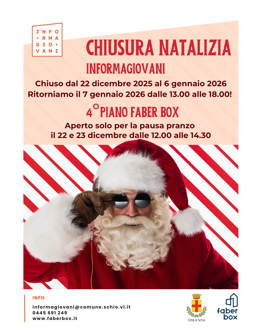 L’ufficio Informagiovani e tutto il 4° piano del Faber box chiude dal 22 dicembre 2025 al 6 gennaio 2026.