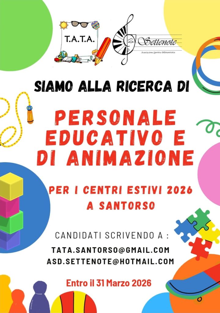 T.A.T.A. TEMPO AL TEMPO ASSOCIAZIONE DI PROMOZIONE SOCIALE è alla ricerca di personale educativo e di animazione per la Stagione Estiva 2026.