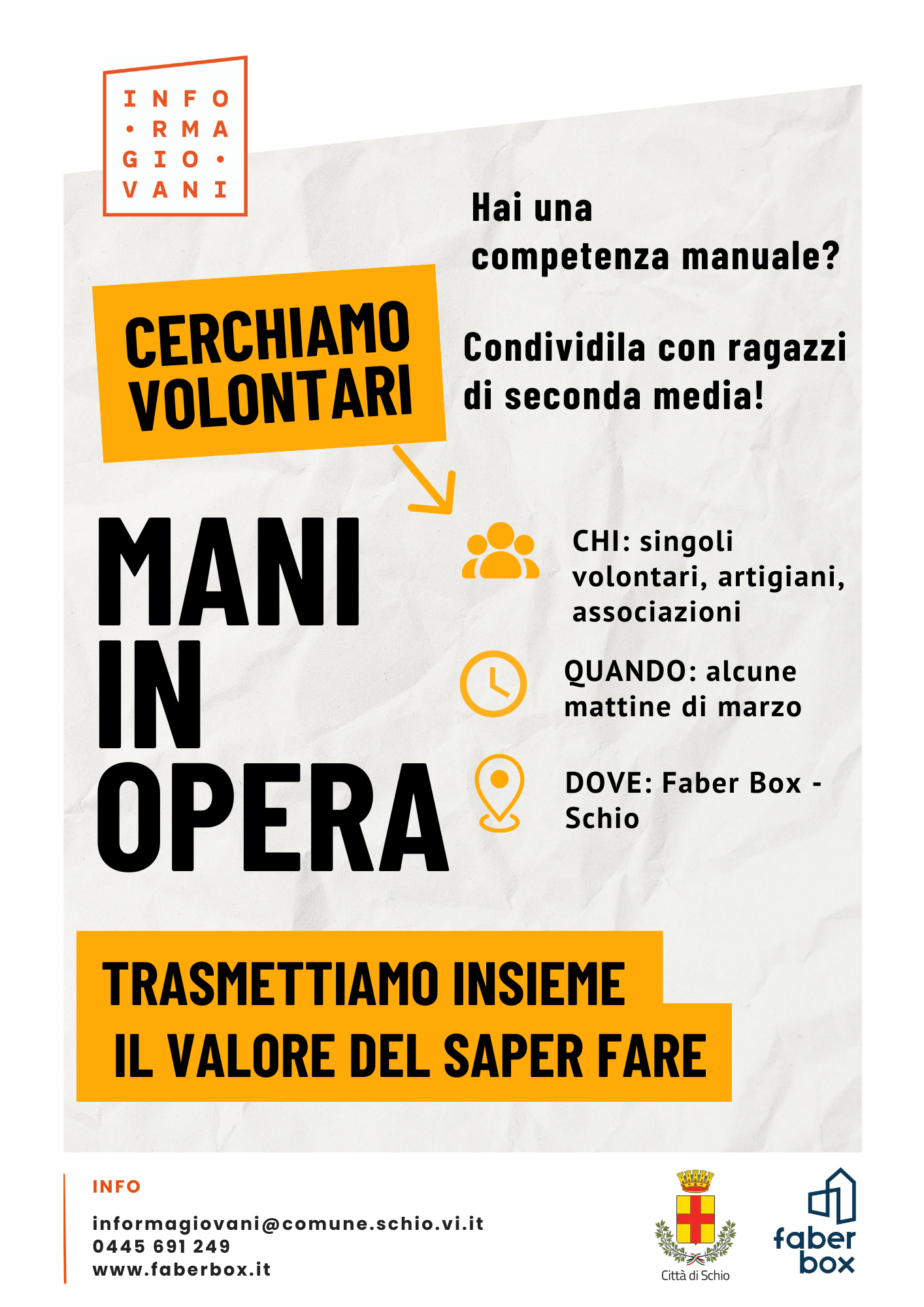 Informagiovani Schio proporrà nel prossimo mese di marzo dei laboratori per ragazzi delle scuole medie, con l’obiettivo di introdurli ad attività manuali che potrebbero aiutarli a sviluppare e a conoscere le proprie abilità.