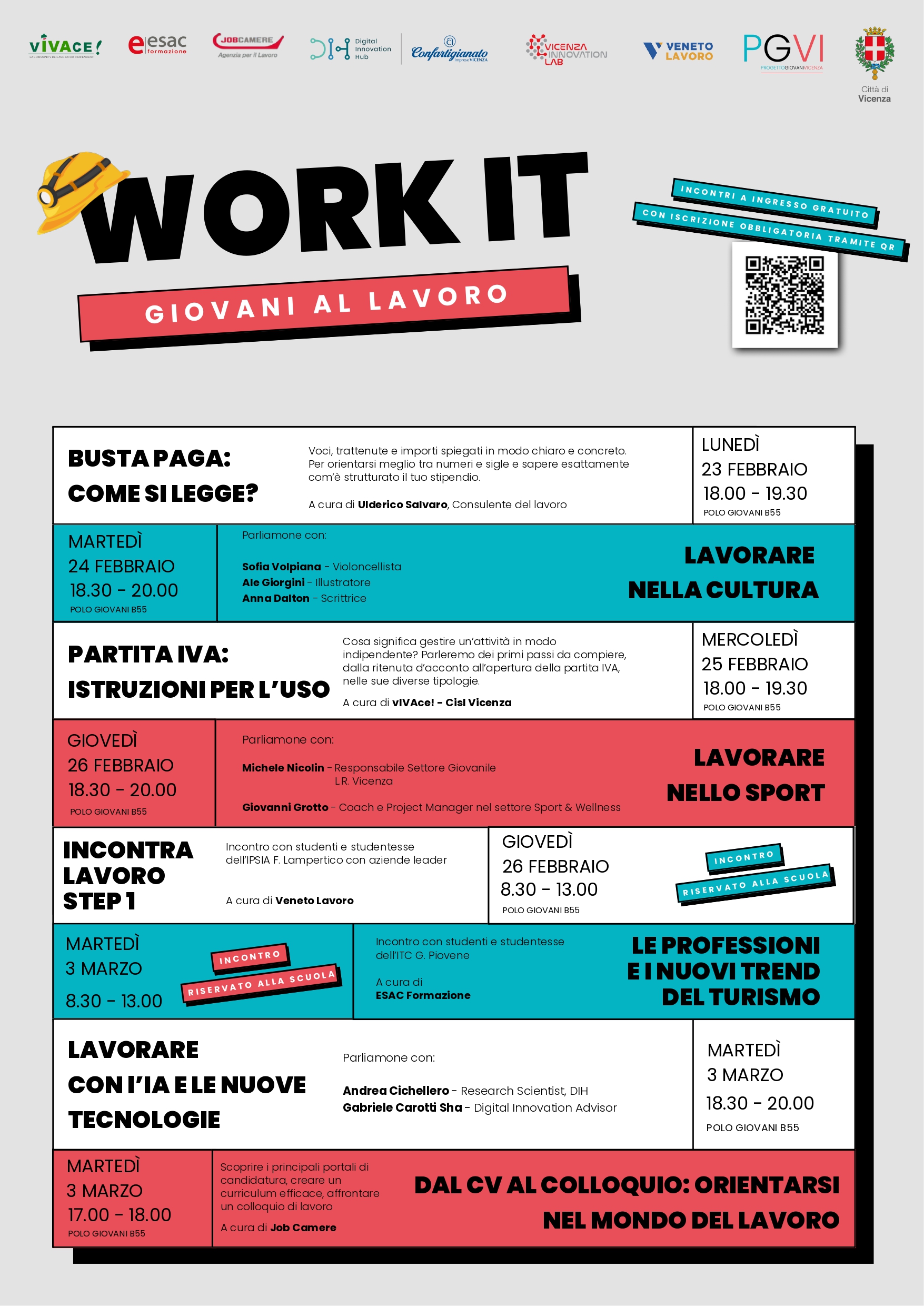Accompagnare le nuove generazioni nella scoperta del mondo del lavoro, tra orientamento, formazione e testimonianze dirette. È questo l’obiettivo di WORK IT – Giovani al lavoro, il ciclo di incontri in programma tra febbraio e marzo di Progetto Giovani Vicenza, dedicato principalmente a persone under 35 interessate a comprendere le opportunità professionali di oggi e di domani.
