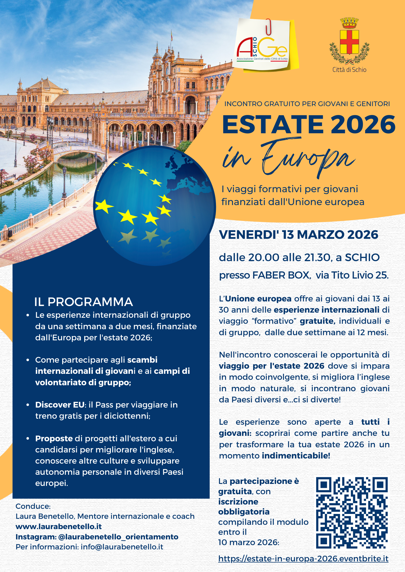 Associazione Genitori Schio (AGE) organizza un incontro gratuito per giovani e genitori per presentare le opportunità di mobilità internazionale promosse e finanziate dall’Unione europea per l’estate 2026. Verranno illustrate esperienze formative all’estero, sia di gruppo sia individuali, della durata variabile da due settimane fino a dodici mesi, rivolte a giovani dai 13 ai 30 anni.
