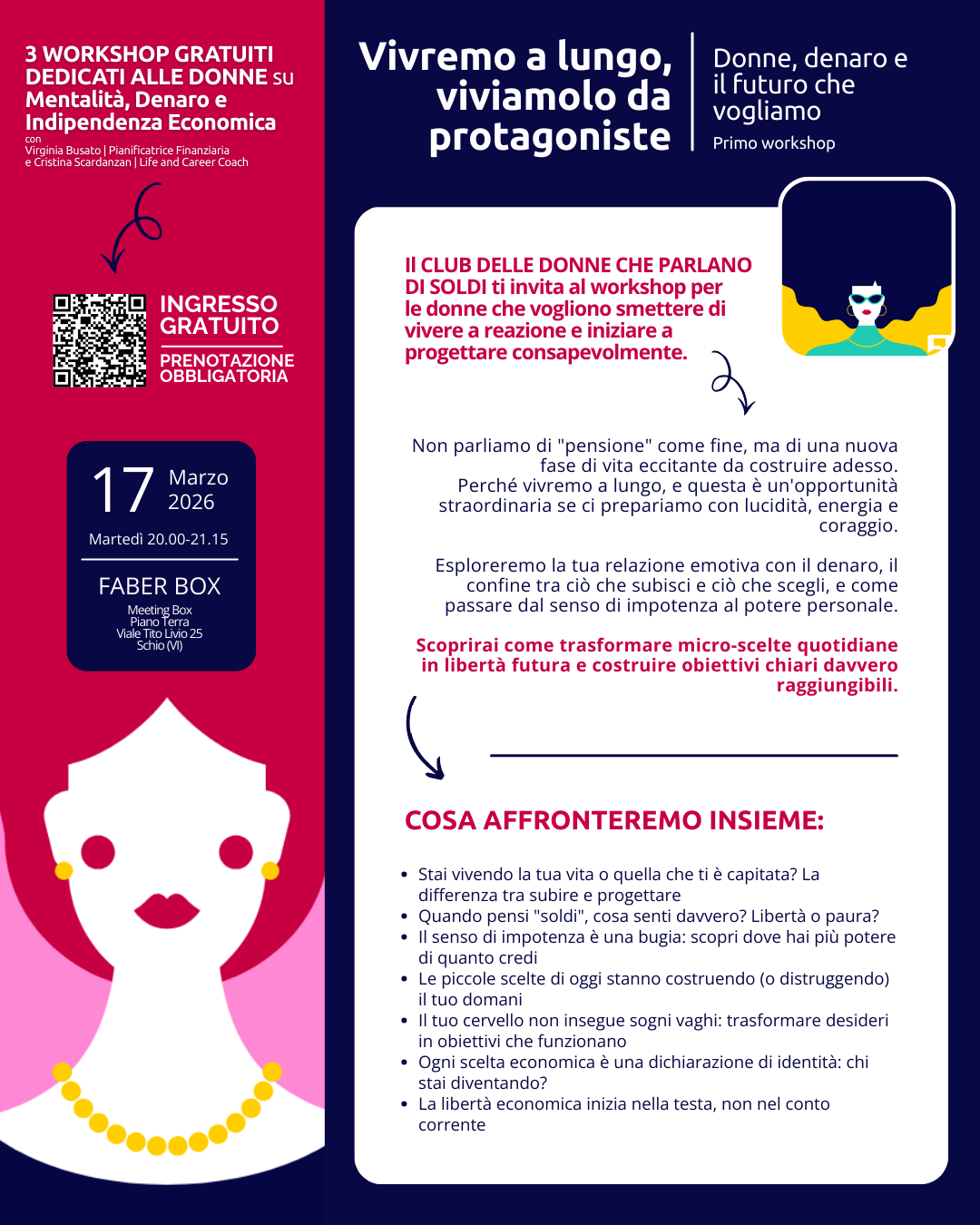 Nel corso della serata interverranno Virginia Busato (pianificatrice finanziaria) e Cristina Scardanzan (life and career coach)