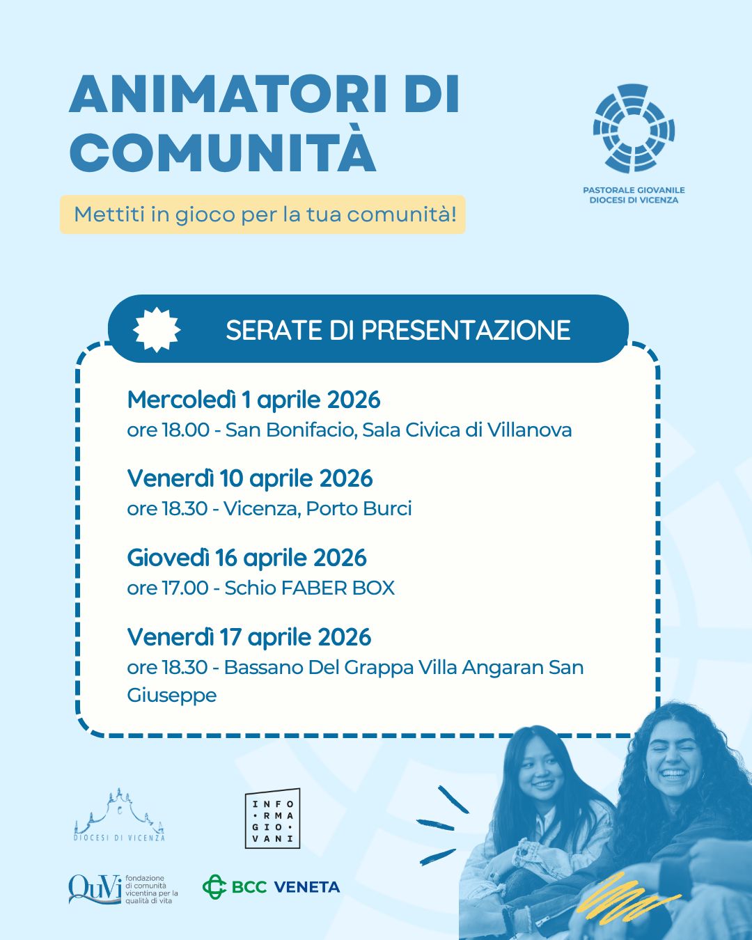 Se sei interessata al lavoro di animatore di comunità e vuoi capire come partecipare al progetto nella triennalità 2026-2029, partecipa agli incontri informativi della Diocesi di Vicenza!