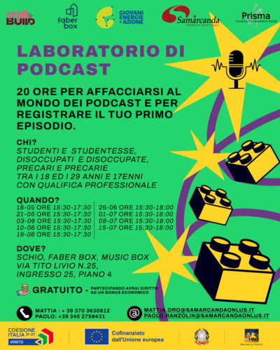 Hai sempre voluto capire come si fa un podcast? Assieme a Samarcanda SCS Onlus puoi trasformare la curiosità in competenza. Un laboratorio pratico di 20 ore ti guiderà passo dopo passo nel mondo del podcasting: dalle tecnologie alle tecniche di presentazione, fino alla registrazione del tuo primo episodio vero e proprio.